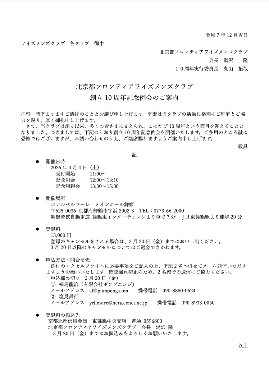 いつもお世話になっております。北京都フロンティアワイズメンズクラブです。