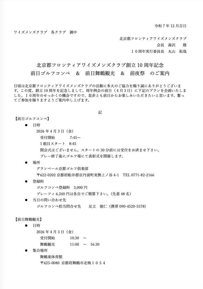 いつもお世話になっております。北京都フロンティアワイズメンズクラブです。