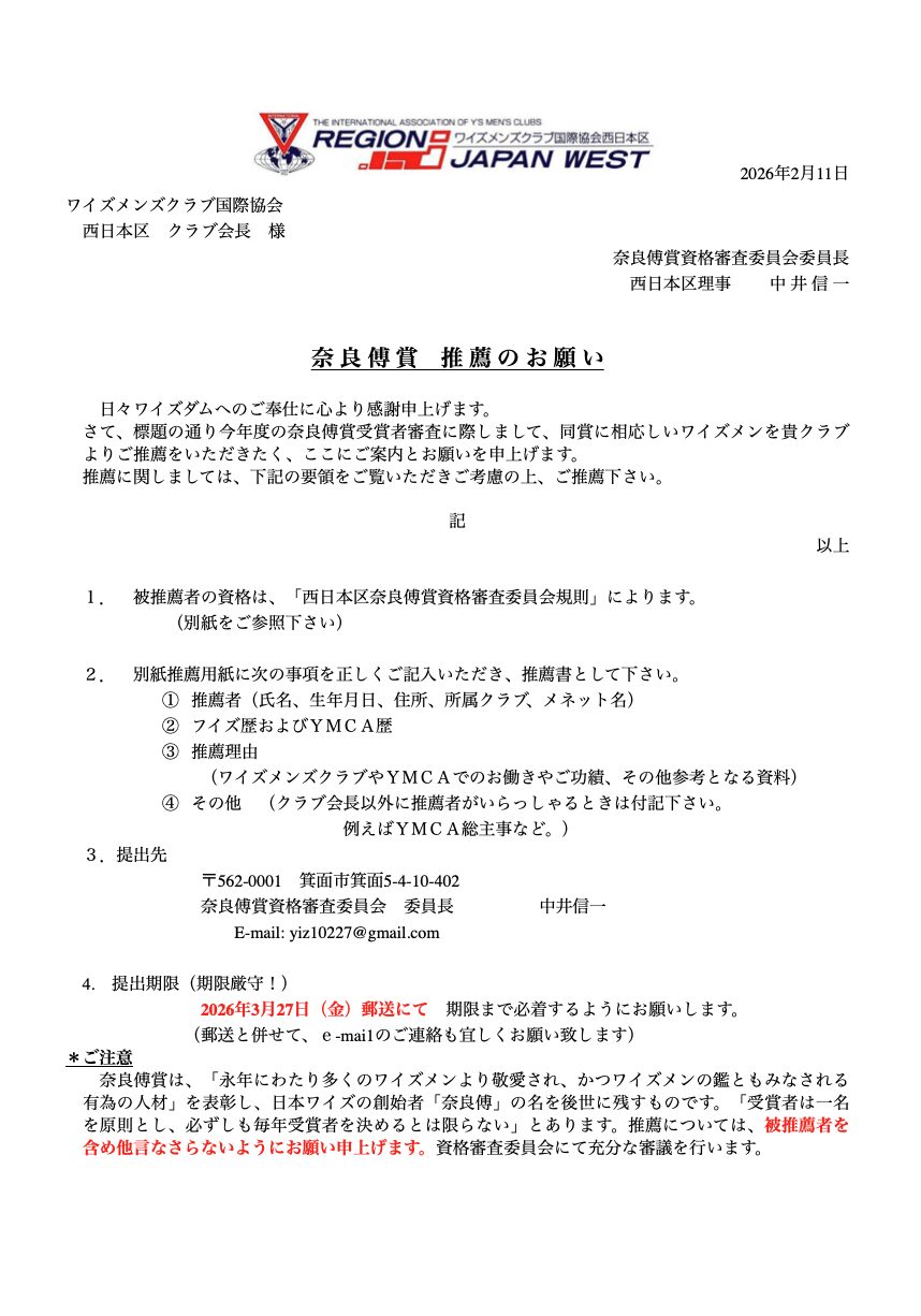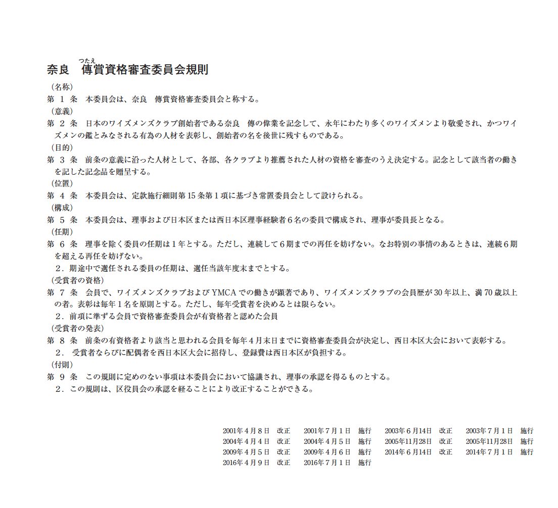 さて、日本のワイズメンズクラブ創始者である奈良傳氏の偉業を記念して、