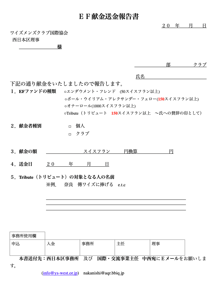 「EF献金送金報告書」をメールにてお知らせ願います