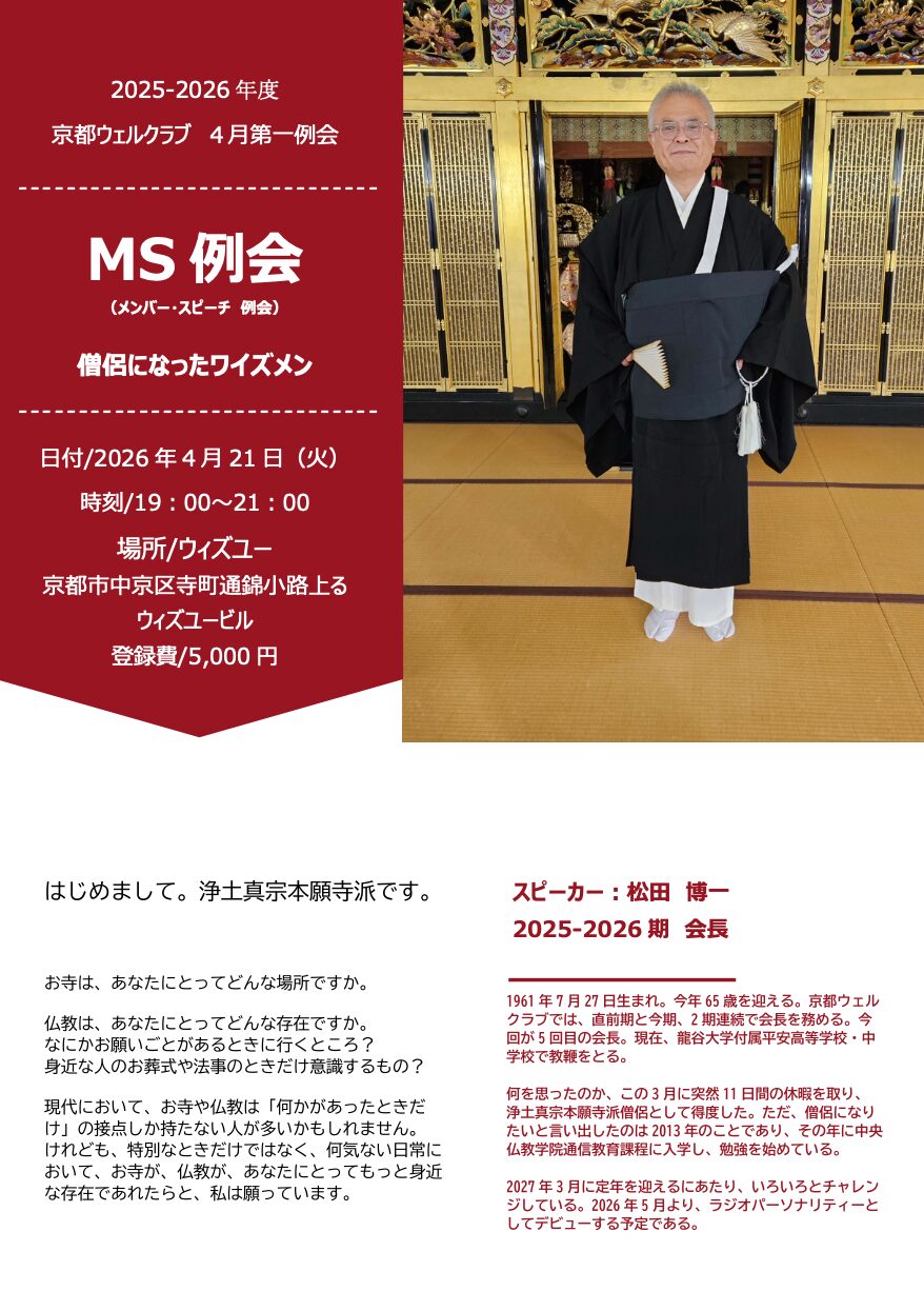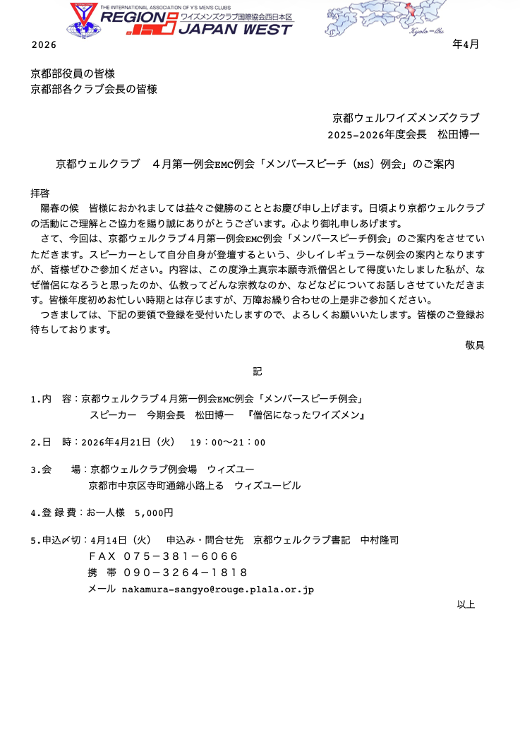 京都ウェルクラブより、4月第1例会(EMC例会)の案内が届きましたので、