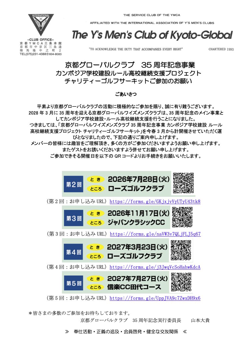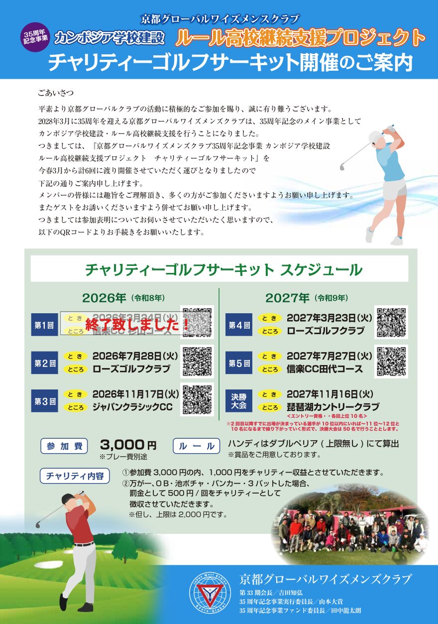 京都グローバルクラブから35周年記念事業チャリティーゴルフサーキットの案内です。