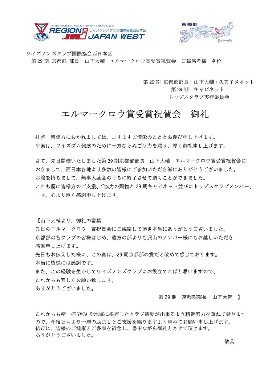 京都部第29代部長、山下大輔、エルマークロウ賞受賞祝賀会に、
