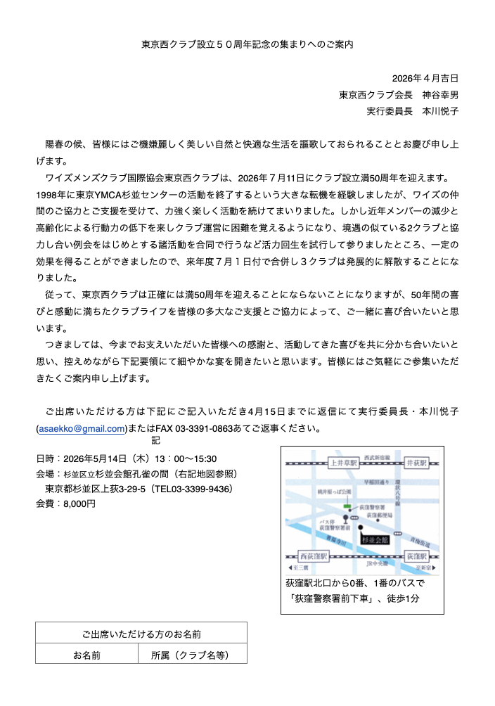 さて、東京西クラブは2026年7月11日に設立50周年を迎えますが、その日を