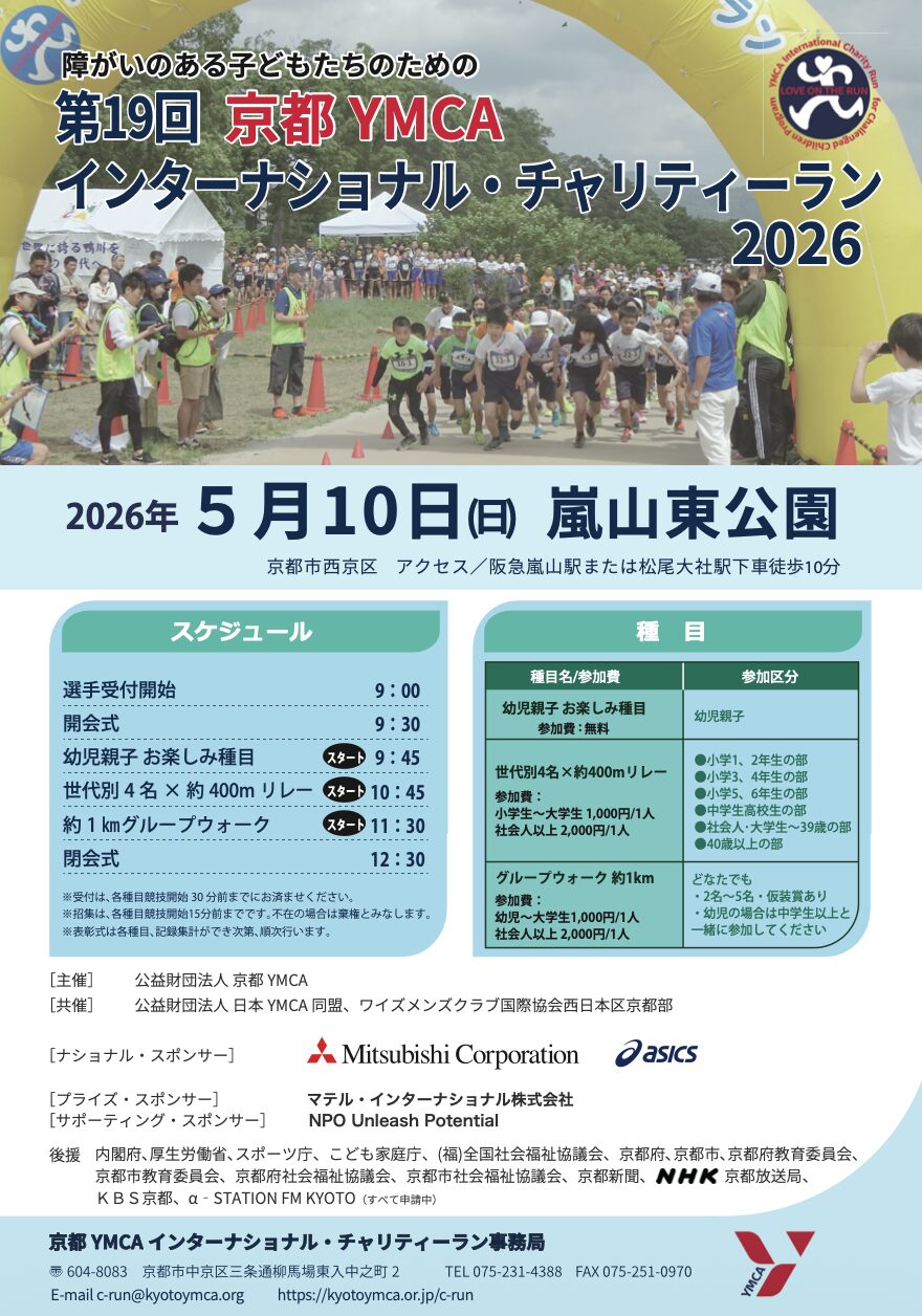 5月10日開催の障がいのある子どもたちを支援する「第19回京都YMCAインターナショナルチャリティーラン」は参加者、協賛募集中です。