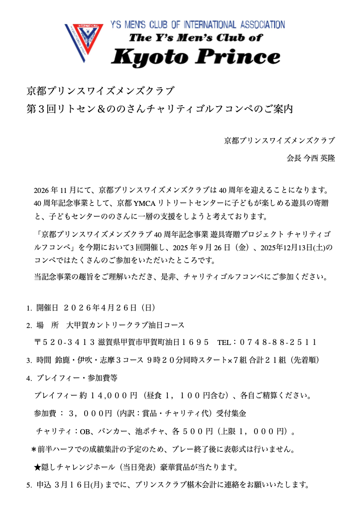 京都プリンスクラブより、チャリティコンペの案内が届きましたので、