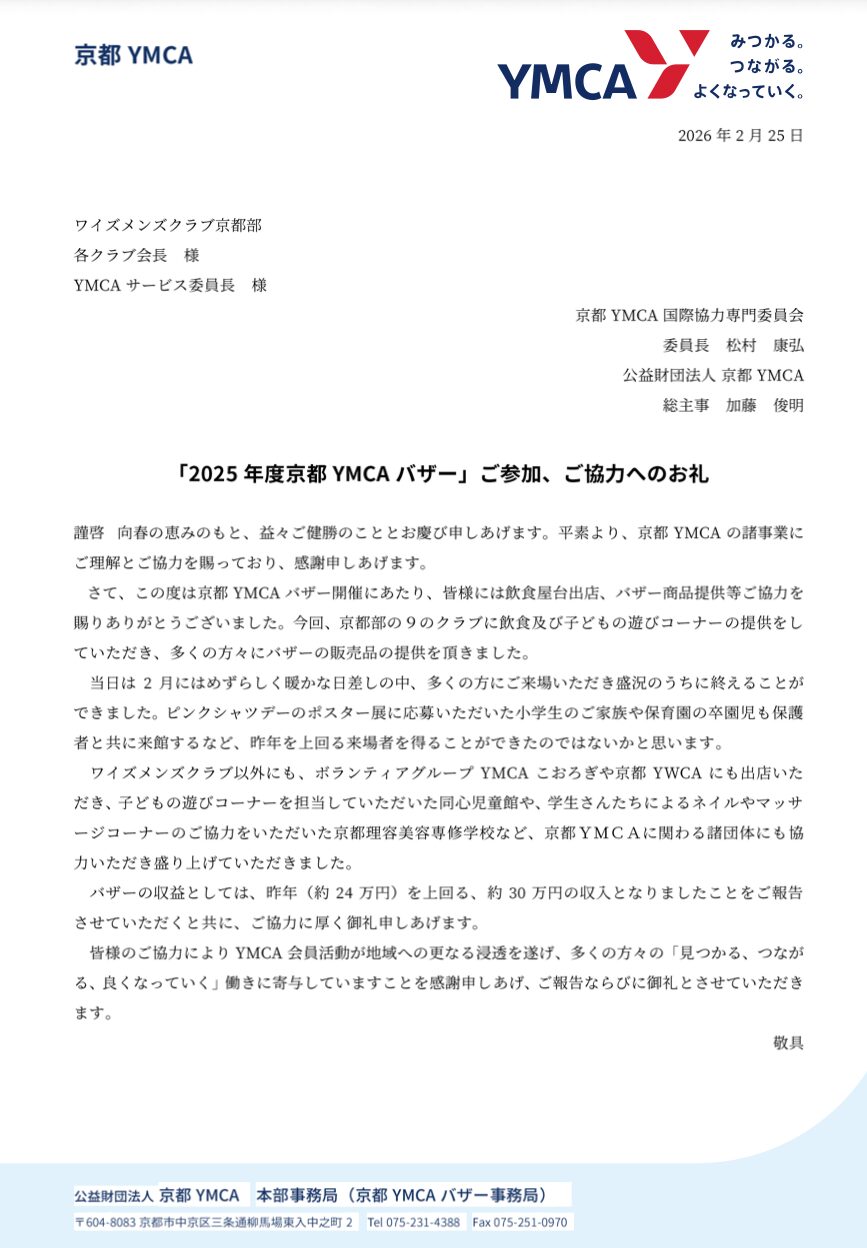 2月22日開催のバザーお礼状を添付します。
