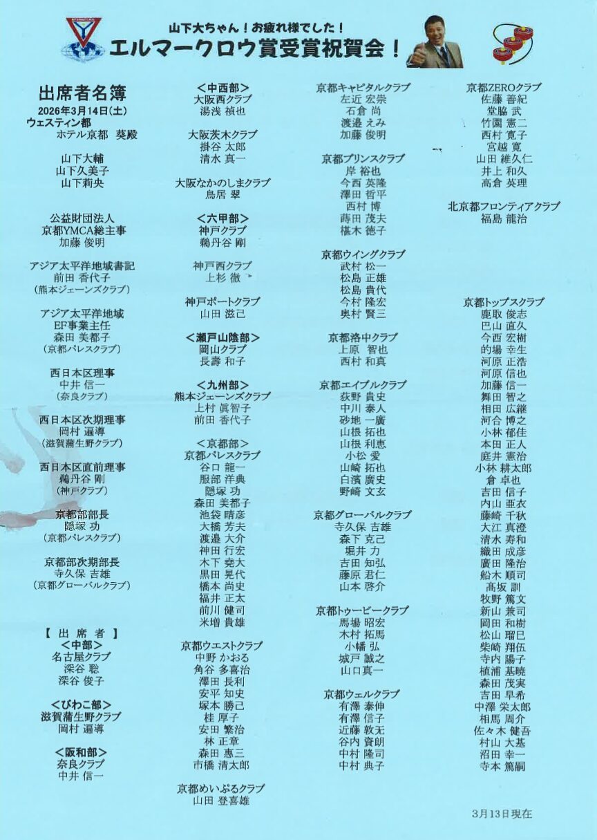 山下大輔ワイズ(京都部直前部長)のエルマークロウ賞受賞記念祝賀会のご案内について