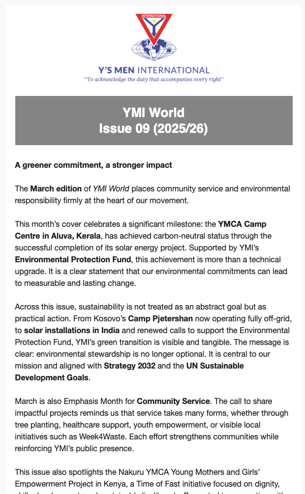 YMI World 3 月号では、コミュニティ サービスと環境責任を私たちの運動の中心にしっかりと位置付けています。